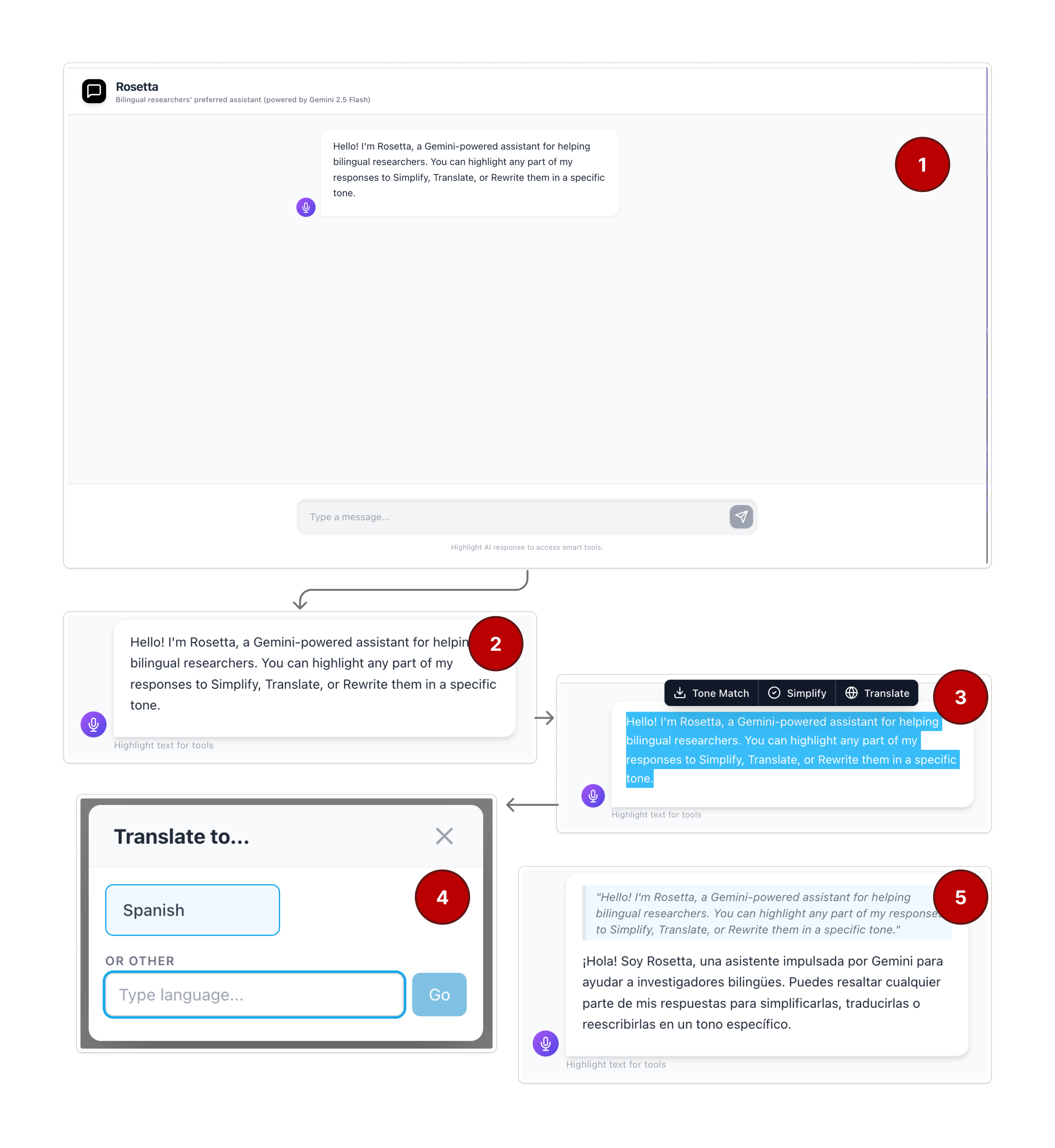 During usability testing, participants gravitated toward fine-grained controls rather than trying to craft perfect prompts upfront. They frequently highlighted portions of AI responses to adjust tone or clarify meaning, treating the output as a draft to refine rather than a final product. Language switching happened fluidly when visual feedback made it clear which mode was active.